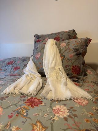 Bufanda tejida a mano con un diseño delicado y flecos. - Material suave y ligero. - Acabado artesanal.