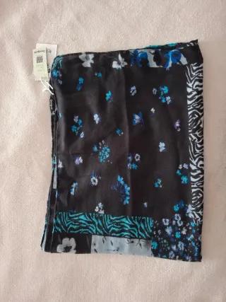 Foulard suave con un diseño alegre y combinable. Ideal para darle un toque especial a tu estilo. Medidas: 1,85 x 97 cm Sin estrenar. Tiene la etiqueta. - Estampado floral en tonos azules y rosas. - Tacto agradable.