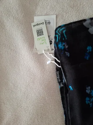 Fular Desigual con un diseño llamativo que combina flores y estampado de cebra. - Base negra con detalles florales en azul. - Tiras con estampado de cebra en los bordes. - Tejido ligero y suave. - Poliester