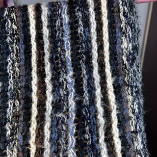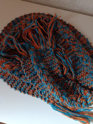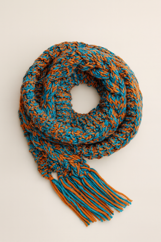 Bufanda tejida a mano con un diseño trenzado y flecos. - Combinación de hilos en tonos azules y naranjas. - Textura gruesa y cálida. - Acabado con flecos en los extremos.