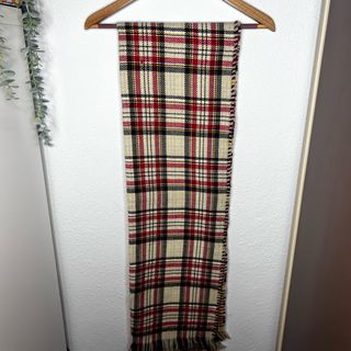 Bufanda con un clásico diseño de cuadros. - Patrón de cuadros en tonos beige, rojo y negro. - Bordes con flecos.