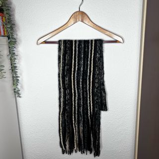 Bufanda de punto suave con un diseño de flecos en un extremo. Es un accesorio cálido y con textura. - Tejido de punto grueso. - Flecos largos y deshilachados.