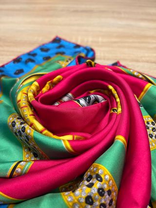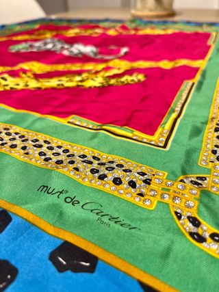 Must de CARTIER -Pañuelo muy exclusivo con estampado de pantera de Cartier en oro y plata. Margen decorado con piedras preciosas. -100% original y seda auténtica hecho en Italia. -Muy buen estado de conservación. -Dimensiones 90x90cm -Colores deslumbrantes en verde esmeralda, rojo rubí, azul zafiro… -Etiqueta del material presente. -Diseño único y exclusivo de la marca. -Existencias AGOTADAS, solo venta en mercado de segunda mano. -Vendedor de confianza y valoraciones 5*****.