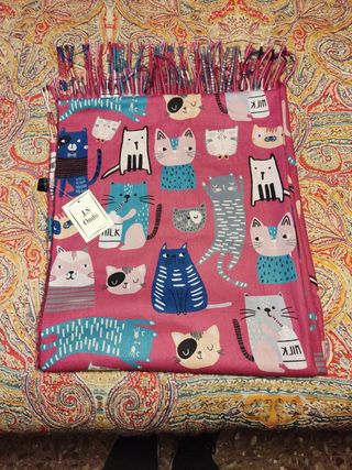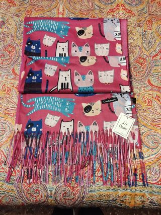 Fular/bufanda grande fondo fucsia y estampado de gatos. Sin estrenar. Medidas: 1'70 largo x 70 ancho. Tacto suave.