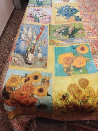 Fular fino con nueve escenas florales de cuadros de Van Gogh. No tiene etiqueta, pero está sin estrenar. Medidas: 1'77 largo x 65 de ancho.