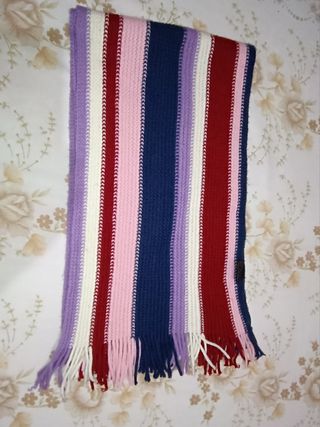 Bufanda de rayas de colores. Es de acrílico y tiene flecos. Está en buen estado.
