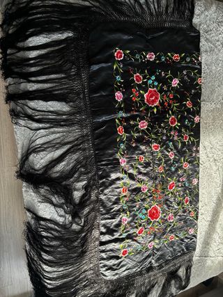 Precioso mantos, ideal para cualquier ocasión.prenda únicas y vistosa. - Bordado artesanal con flores multicolores. - Flecos largos y decorativos. - Tejido suave y ligero. Negro de terciopelo.... Juntos o por separado