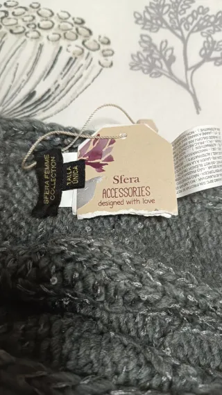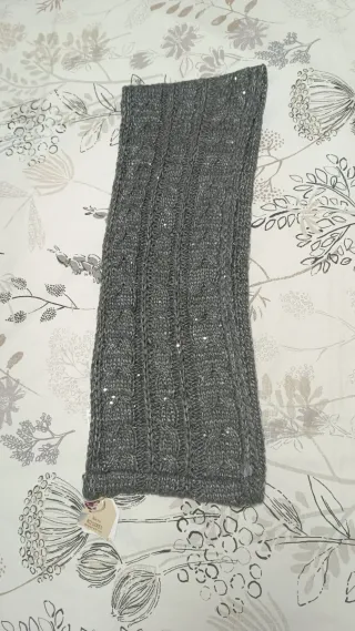 Bufanda de punto gris con un diseño trenzado y detalles brillantes. Es suave y cálida. - Tejido con hilo plateado y lentejuelas. - Diseño de ochos. - Tacto agradable.