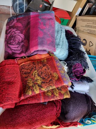 Lote de 20 bufandas y cuellos para señora y caballero. Incluye diseños variados y un artículo con Hello Kitty. - Variedad de colores y texturas. - Algunos artículos con diseños de equipos deportivos.