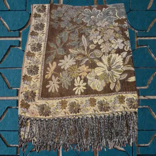 Elegante pashmina con un intrincado bordado acabado oro. - Diseño floral detallado. - Borde decorativo con flecos. - Tejido con hilo dorado. Medidas 180 CMS de largo *70 ancho.