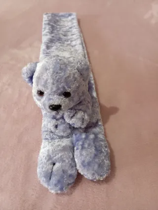 Bufanda suave con forma de osito, ideal para abrigarse con un toque tierno. - Material de peluche. - Diseño de osito con cabeza y patas. - Color celeste