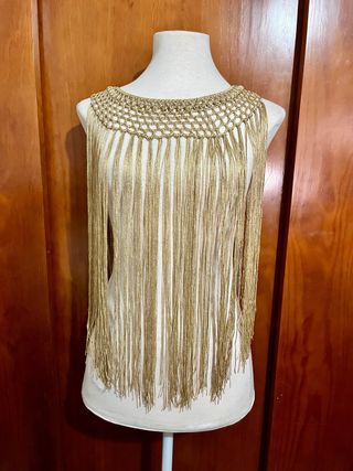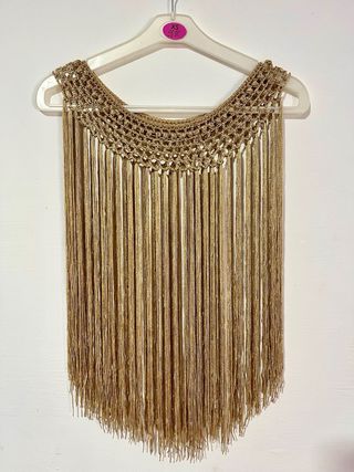 Este cuello de crochet artesanal añade un toque de brillo y sofisticación. - Diseño intrincado de crochet. - Adornado con flecos largos y brillantes.
