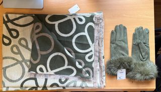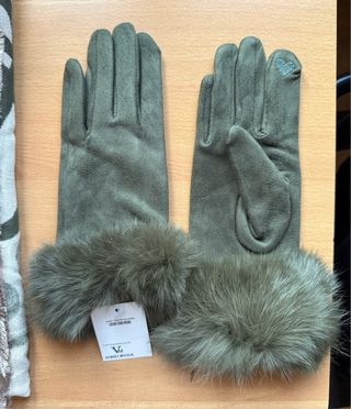 Conjunto de bufanda y guantes de Viwei Moda. - Bufanda con estampado de bucles en tonos verdes y beige. - Guantes de ante con detalle de pelo en los puños.