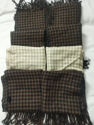 Conjunto de 8 bufandas con un clásico estampado de pata de gallo. Son suaves y cálidas, perfectas para complementar tu atuendo. Largo 1,68 cms Ancho 44 cms Nuevas sin etiquetas .. - Diseño de pata de gallo. - Acabado con flecos.