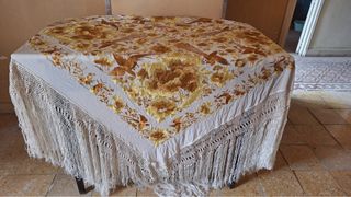 Elegante Mantón de Manila 100% seda, con delicado bordado floral en tonos dorados y marrones. Pieza artesanal con flecos largos y en perfecto estado de conservación. Ideal para eventos especiales, decoración o coleccionistas de piezas únicas. Medidas aproximadas: 140x140 cm (sin contar los flecos). ¡Una joya clásica que nunca pasa de moda!