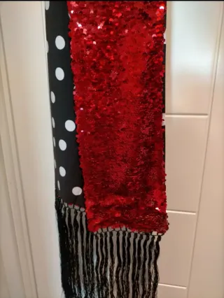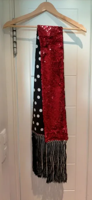 Echarpe con un diseño llamativo y festivo. - Mitad con lentejuelas rojas brillantes. - Mitad con estampado de lunares blancos sobre fondo negro. - Flecos negros en el borde inferior. Mide 125cms sin flecos Hecho a mano por la artista Patricia Palmero de Sevilla