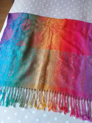 Preciosa pashmina con un diseño vibrante y lleno de color. Perfecta para añadir un toque especial a cualquier atuendo. - Diseño de cachemir. - Flecos en los extremos.
