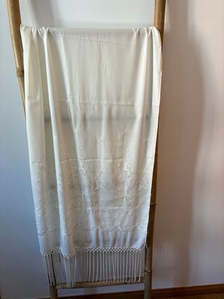 Elegante mantón triangular con un diseño floral y flecos. - Adorno plateado con motivos florales. - Flecos largos y plateados en todo el borde. Elegante y con mucho brillo, ideal para eventos, bodas o como complemento de madrina. Ha sido usado en muy pocas ocasiones (una o dos veces), se conserva en muy buen estado. El tejido es suave, con fondo de rejilla y bordado en hilo plateado que le da un toque distinguido y atemporal. Perfecto para combinar con vestidos de fiesta o looks más formales. Se puede gacet lote con el mantón negro y rojo