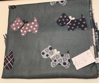 Pasmina con un encantador estampado de perros Scottie en tonos verdes y morados. Muy versátil para cualquier tipo de look. - Diseño divertido y original. - Tacto suave y agradable. Nuevo con etiquetas.