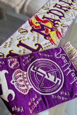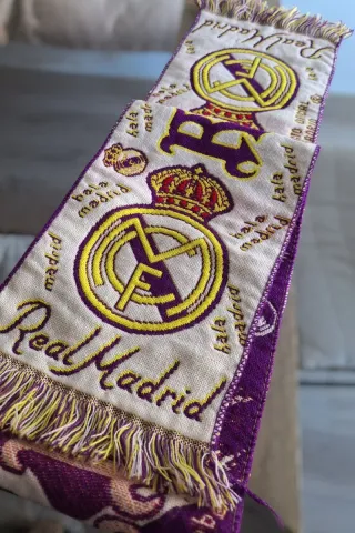 Bufanda del Real Madrid del año 93. Bufanda de coleccionista. Bufanda vintage - Diseño con el escudo del club. - Bordado Real Madrid y Hala Madrid. - Flecos en los extremos.