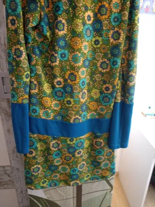 Vestido de estilo hippie con un llamativo estampado floral. Presenta un diseño único y colorido. - Mangas largas. - Cuello tipo bufanda. - Detalle de banda en color azul. - Bajo del vestido con banda en color azul.