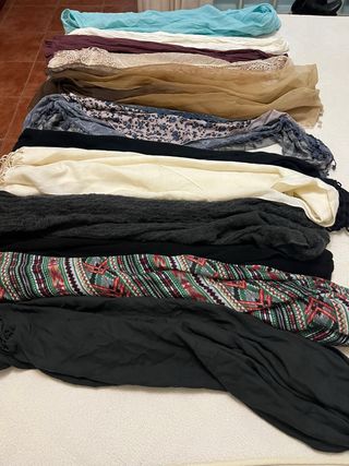 Conjunto variado de 12 pañuelos y bufandas con diferentes texturas y estampados.
