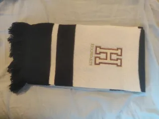 Bufanda de rallas blancas y negras de la marca Women'secret con la inicial de Hogwarts bordada.