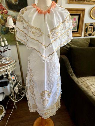 Incluye - mantilla y delantal. Dimensiones Delantal - 79x45cm. Escote mantilla 96cm. Triángulo 37x109cm. En buen estado vintage, sin daños.