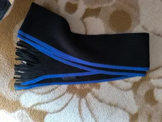 Bufanda con diseño de rayas en tonos azules y negros. Perfecta para añadir un toque de estilo a tu atuendo. - Diseño de rayas horizontales. - Acabado con flecos en los extremos.
