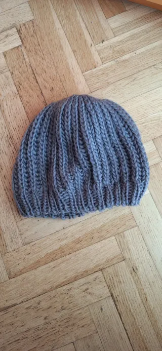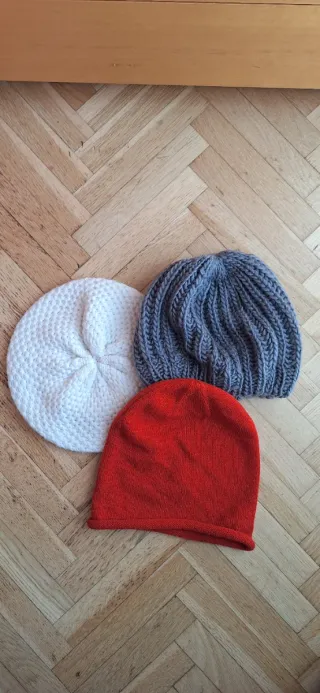 Conjunto de tres gorros de punto + regalo de gorro y bufanda. - Gorro blanco con textura. - Gorro gris de canalé. - Gorro rojo liso.