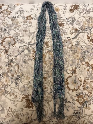 Fular con un bonito estampado en tonos azulados y morados. Tiene un diseño elegante y es perfecto para complementar cualquier atuendo. - Diseño de figuras. - Flecos en los extremos.