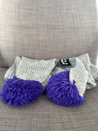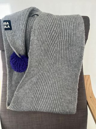 Bufanda de punto gris con un detalle de pompón morado. - Diseño de canalé. - Etiqueta de la marca. En la parte más ancha mide 40 cm y el largo total es de 180 cm. Como se puede apreciar, está sin usar. Y el color real es el de la mayoría de las fotos, gris claro.