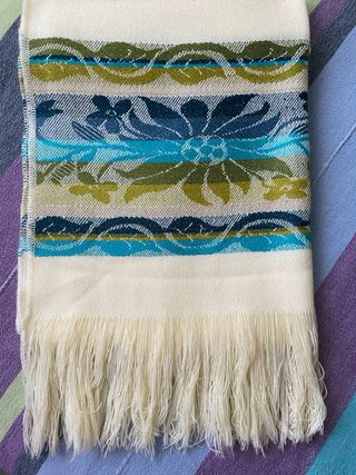 Bufanda completa de lana Ecuatoriana con un diseño vibrante. - Tejido suave y cálido. - Adornos florales y geométricos. - Flecos en los extremos.