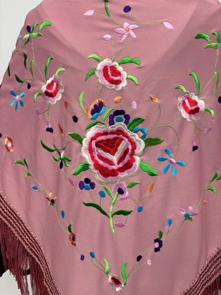 Precioso mantón de forma triangular con un delicado bordado floral en varios colores. Los bordes están adornados con una franja tejida y flecos largos en color lila. - Medidas: 156x77cm (sin contar los flecos). - Diseño: Bordado floral. - Adorno: Flecos.