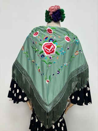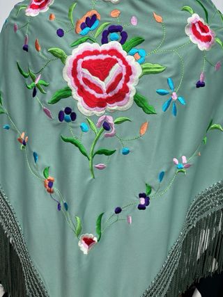 Mantón verde agua con bordado multicolor es triangulo, las medidas 150cm de largo x70cm de ancho, es nuevo sin . estrenar #feria #llamenco #romeria #manton