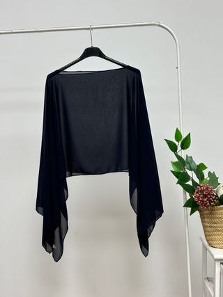 Chal invitada gasa negro de fiesta, tiene abertura para meter la cabeza, puedes ponerlo en varias formas según qué te guste más, perfecto para cualquier eventos, con medida 148cm de largo y 88cm de ancho, nuevo nunca se ha usado #fiestas #chalesfemme #bodasbautizoscomuniones #gasa #chal