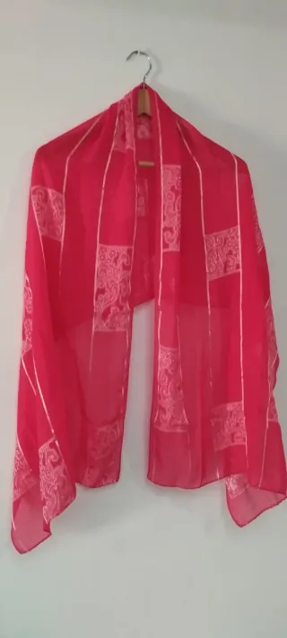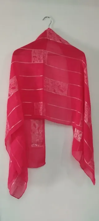 Precioso chal o pañuelo largo, con un diseño elegante y semitransparente. 54 × 166 cm. - Color fucsia vibrante. - Detalle de motivos decorativos plateados.