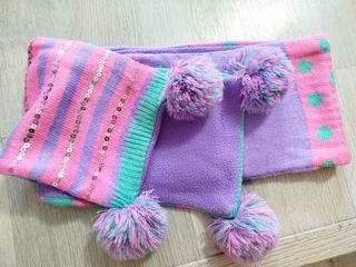 Conjunto de bufanda y gorro con un diseño divertido y colorido. - Bufanda con rayas rosas, moradas y turquesas, adornada con lentejuelas. - Gorro a juego con pompones. - Tejido suave y cálido.