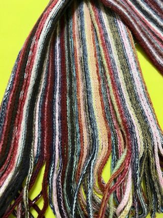 Bufanda de lana suave con un diseño de rayas verticales. - Diseño de rayas en tonos morados, rosas, blancos, verdes y azul - Acabado con flecos en los extremos. - Comprada en el Corte Inglés Medidas 180x24