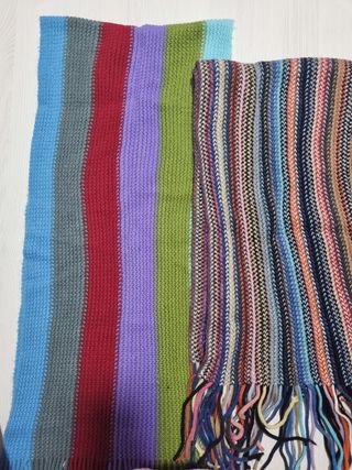 Perfecta bufanda para añadir un toque de color a tu atuendo. Colores alegres, tejido grueso y con flecos.