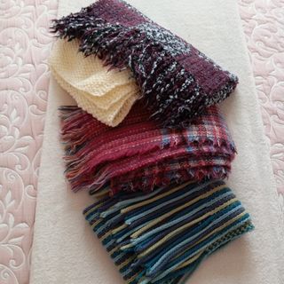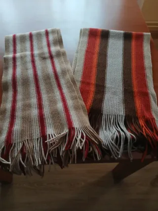 Conjunto de tres bufandas de punto con un diseño tejido y texturizado. - Bufanda de tonos tierra y blanco. - Bufanda de color coral con flecos. - Bufanda verde con rayas azules.