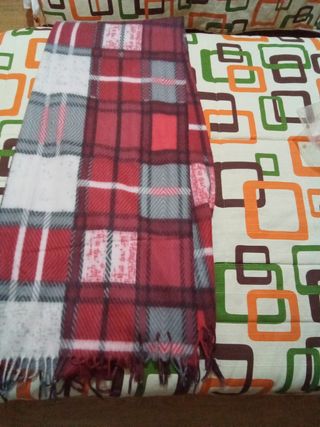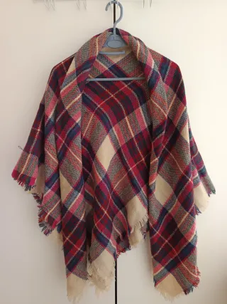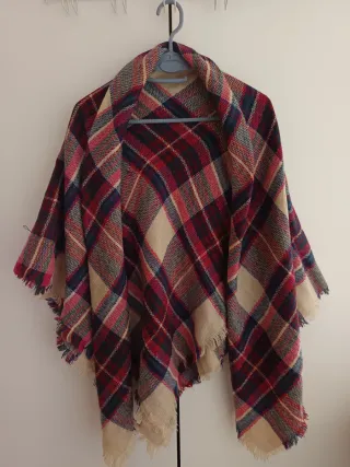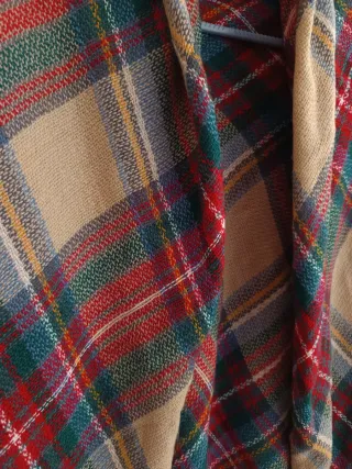 Pañuelo de gran tamaño con estampado de cuadros tartán. Colores beige, rojo y verde. - Diseño clásico de cuadros. - Bordes deshilachados para un toque bohemio. - Tejido suave y cálido. Usado varias veces pero en buenas condiciones 😊