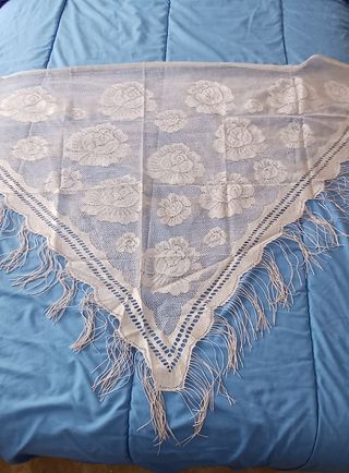 Precioso chal tejido a mano, perfecto para añadir un toque de color a tu atuendoo para regalar. - Diseño intrincado con detalles calados. - Borde festoneado decorativo. - Textura suave y agradable al tacto.