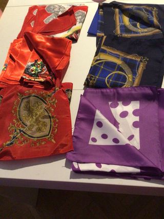 Conjunto de seis pañuelos para el cuello con diseños variados. - Pañuelos con estampados de motivos clásicos y lunares. - Tejido sedoso y ligero. lote 9€. uno X 3€. ideales para hacer cojines, cuadros, manteles mesita pequeña, pañuelos cuello, adorno en el bolso, bandera de adorno.....lo que tú quieras. más de uno X 2’50.