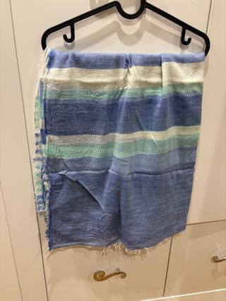 Preciosa bufanda ligera, ideal para la primavera u otoño. Es de color turquesa y blanco, con un diseño elegante y moderno. - Diseño con estampado de rayas y figuras geométricas. - Tejido suave y ligero.