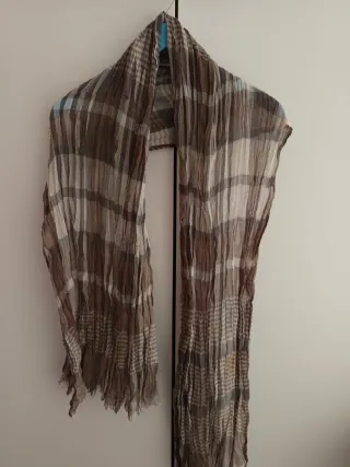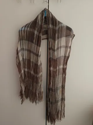 Fular con estampado de cuadros en tonos marrones y beige. Su tejido ligero y plisado le da un toque moderno. - Diseño a cuadros. - Acabado con flecos en los extremos. Es buen estado, no dudes en preguntar 😊