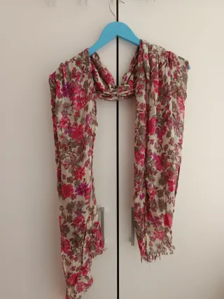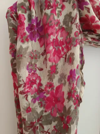 Pañuelo con un bonito estampado floral. - Diseño con flores en tonos rosas y detalles en beige. - Tejido ligero y vaporoso. En perfectas condiciones, no dudes en preguntar 😊
