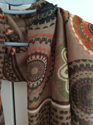 Pañuelo con un diseño llamativo y colores tierra. - Estampado con motivos circulares y geométricos. - Tonos marrones, naranjas y verdes. - Tejido ligero y fluido.