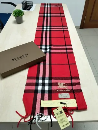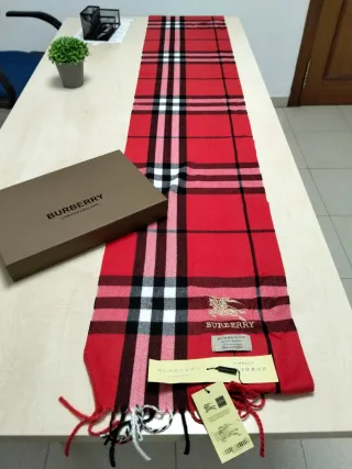 Bufanda clásica con el icónico estampado de cuadros. - Diseño a cuadros en tonos rojos, negros y blancos. - Detalle de flecos en los extremos. - Incluye etiquetas originales.