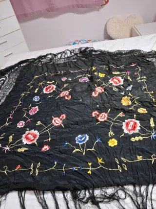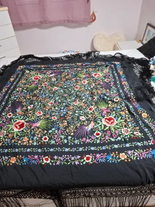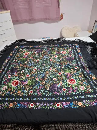 Precioso mantón de Manila con bordado artesanal. - Diseño floral y de aves. - Flecos largos y detallados. - Base negra con múltiples colores en el bordado.o